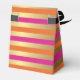 Eine Hochzeit danke Ihnen Tasche mit einem eleganten Muster aus rosa, orange und Imitat goldfarbenen metallischen Streifen. Obergeschichtet ist ein extravaganter weißer Rahmen, personalisiert mit den Namen der Braut und der Zelthäute, dem Hochzeitstag, und danke.