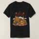 Ein lebendiges Erntedank-T - Shirt-Design mit einem spielerischen Truthahn mit einem "Thankful & Segigen"-Banner, umgeben von bunten Herbstblättern, Kürbissen und Cornucopia-Elementen. Das Design strahlt Wärme aus, reich an Orange, Rot und Gold und verkörpert den festlichen Geist der Dankbarkeit und Zusammengehörigkeit.