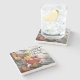 Ein inspirierender Untersetzer aus Stein zeigt einen Korb, umgeben von bunten Herbstgürteln und gelben Blätter auf einem hellgrauen Holzfußboden. Es enthält die ermutigenden Worte: "Dankbar, gesegnet."
