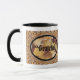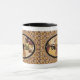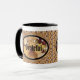 Herbstblätter und das Wort "Dankbar" sind mit einem ovalen schwarzen, wirbeligen und gekachelten Herbstblättern auf dieser Tasse gerahmt.