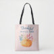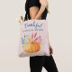 Eine Tasche mit Typografie, die sagt: Dankbar gesegnet, perfekt für den Erntedank Saison. Ein Bild eines orangefarbenen Kürbis mit Herbstblättern und Sprigs. Rosa und goldgestreiftes Muster für den Hintergrund.