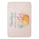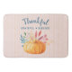 Eine Badematte mit Typografie, die sagt: Dankbar gesegnet, perfekt für den Erntedank Saison. Ein Bild eines orangefarbenen Kürbis mit Herbstblättern und Sprigs. Rosa und goldgestreiftes Muster für den Hintergrund.