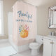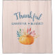 Duschvorhang mit Typografie-Text, der sagt: Dankbar gesegnet, perfekt für den Erntedank Saison. Ein Bild eines orangefarbenen Kürbis mit Herbstblättern und Sprigs. Rosa und goldgestreiftes Muster für den Hintergrund.