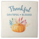 Keramik Kachel mit Typografie Text, der sagt: Dankbar gesegnet. Ideal für den Erntedank. Ein Bild eines orangefarbenen Kürbis mit Herbstblättern und Sprigs.