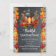 "Dankbar, Dankbar und gesegnet" Erntedank Dinner Fest Design mit einer schönen HerbstLaterne mit beleuchteter Kerze als Kernstück einer Tischanordnung von schönen Herbstlauben in pulsierender Herbstpracht. Im Hintergrund befindet sich ein Kalkbrett, das auf beiden Seiten mit herrlichen Herbstlauben flankiert ist und von einem rustikalen, gewaschenen Holzplanken unterlegt ist. Composite Design von Holiday Hearts Designs.
