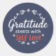 Erhöhen Sie Ihre tägliche Erinnerung mit diesem wunderschön gestalteten Rundaufkleber mit der aufziehenden Botschaft: 'Dankbarkeit beginnt mit der Selbst-Liebe'. Ideal für die Dekoration von Planern, Zeitschriften, Laptops oder Oberflächen, die eine Touch von Positivität benötigen. Der elegante, weiße und rote Text auf tiefblauem Hintergrund, der mit zarten Blattakzenten verziert ist, macht diesen Aufkleber zu einer charmanten Ergänzung Ihrer Sammlung. Ideal, um Freunden, der Familie oder sich selbst als tägliche Bekräftigung der Liebe und Dankbarkeit zu schenken.