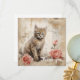 Ein flauschiges Tabbykätzchen mit auffallend blauen Augen sitzt neben zwei rosa Rosen vor einer Kulisse mit Vintagen Schrift- und Tintenklecksen. Die Sepia-Töne verleihen der Komposition, die Blumen und ein süße Tier verbindet, ein warmes antikes Ambiente.