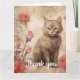 Ein flauschiges Tabbykätzchen mit auffallend blauen Augen sitzt neben zwei rosa Rosen vor einer Kulisse mit Vintagen Schrift- und Tintenklecksen. Die Sepia-Töne verleihen der Komposition, die Blumen und ein süße Tier verbindet, ein warmes antikes Ambiente.