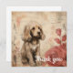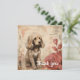 Ein goldbrauner Welpe mit flauschigen Fellen sitzt quasi neben einigen großen, stilisierten Rose. Der Hintergrund ist in abstrakten Beige-Tönen gehalten, mit subtilen blumigen Konturen und skriptähnlichen Schriftzeichen, die der gesamten Komposition ein Vintages und sanftes Gefühl verleihen.