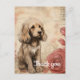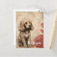 Ein goldbrauner Welpe mit flauschigen Fellen sitzt quasi neben einigen großen, stilisierten Rose. Der Hintergrund ist in abstrakten Beige-Tönen gehalten, mit subtilen blumigen Konturen und skriptähnlichen Schriftzeichen, die der gesamten Komposition ein Vintages und sanftes Gefühl verleihen.