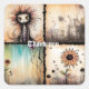 Ein skurriler Charakter mit wilden Haaren und großen Augen besticht durch das links Quadrat, der auf eine ästhetische Ästhetik im Stil von Tim Burton hinweist. Der obere rechte Platz besticht durch eine gotische Architektur mit einer trostlosen, möglicherweise postapokalyptischen Atmosphäre, während die unteren Quadrate stilisierte, lebendige Blume vor einem ätherischen Hintergrund darstellen.