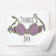 Ein lila, zentraler, limiengrüner BH mit dem Sprichwort "Danke Bra".