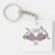 Ein lila, zentraler, limiengrüner BH mit dem Sprichwort "Danke Bra".