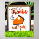 Gib Dankeschön und Eat Pie Erntedank Niedlichen Kuchen Schild im Gras mit Peitsche Sahne perfekt für Erntedank.