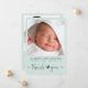 Ein niedliches pastellfarbenes Minzgrün Baby oder Baby Junge dankt Ihnen für Ihre Geburtsankündigung. Die Vorderseite zeigt Foto, Namen, Ankunftsdatum und Geburtsdaten Ihres Babys und "Danke" in einem weichen grauen Schriftsatz, in dem sich ein Herz zu den Wörtern verbindet. Auf der Rückseite fügen Sie ein zusätzliches Foto, personalisieren Sie eine Danksagung und fügen Sie Eltern und Geschwister Namen in grauer Typografie unter einem koordinierenden niedlichen Pfeil mit einem Herz.
