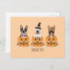 Illustration von drei französischen Bulldog Welpen in verschiedenen Farben in Kürbissen, die in Halloween-Kleidung gekleidet sind.
