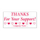 Dieses wertvolle Gummi Briefmarke Design beinhaltet die Nachricht "DANKS For Your Support!" und einen personalisierbaren Firmennamen. Es zeichnet sich auch durch dekorative Herzformen aus. Es könnte von einer Organisation, einem Unternehmen, einem beruflichen Unternehmen oder einem Unternehmen genutzt werden, um Kunden oder Kunden für ihre Unterstützung zu danken.
