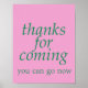 "Danke fürs Coming, You Can Go Now" Poster Fügen Sie mit diesem lebendigen Poster eine spielerische und freche Touch zu Ihrem Platz hinzu! Mit fett grünem Text auf einem hellrosa Hintergrund vermittelt es eine humorvolle und dennoch stilvolle Botschaft, die sich perfekt für ein helles Dekor eignet. Egal, ob es für Ihre Zuhause, Ihr Büro oder ein sonderbares Geschenk ist, dieses Poster wird sicher Lächeln und Gespräche auslösen. Größe: 11" x 14" Stil: Fett und minimalistisch mit einem Pop von Farbe Perfekt für: Schlafzimmer, Einstiegsräume, Büroräume oder als lustiges Geschenk Material: Hochwertiger Druck auf haltbarem Plakatbestand Machen Sie Ihre Wände reden - schnappen Sie sich heute und bringen Sie etwas Platz!
