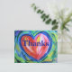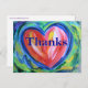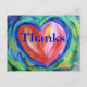 Die Postkarte weist auf "Danke" hin. Die Malerei weist ein farbenfrohes rotes Herz mit glimmernden weißen und goldenen Akzenten auf. Das Herz ist blau umrissen und hat einen weichen grünen Hintergrund. Dieses Gemälde ist eine Hommage an die Hoffnung in Ihrem Herzen, wenn die traurige Blues einen umgibt, aber auf eine grüne Erneuerung drängt. inspirierendes Kunstwerk von Laurel Latto für gemeinnützige DonnaBellas Angels. Aufgabe der gemeinnützigen Organisation ist es, inspirierende Kunst für psychische Gesundheit zu bieten. Das Motto lautet "Medizin heilt den Körper, Kunst heilt das Soul". Weitere Informationen finden Sie online unter DonnaBellasAngels.org.