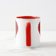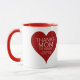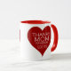 Eine Tasse mit einem schönen DANK MAMA, dass ich HATTE. Ich LIEBE EUCH! Typografie in weißen Buchstaben auf einem roten Herz auf beiden Seiten der Tasse.