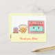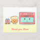 Ein kawaii Cartoon eines Kuchens mit Regenbogensprinkles, der auf einer Holzplattform mit Rädern zieht, um seiner Mutter, dem rosa Ofen, ein Geschenk in Umhüllung zu geben. Die Nachricht lautet: "Danke, Mama!" Eine perfekt skurrile und süße Postkarte, die Mama am Muttertag oder an jedem anderen Tag glücklich macht, nur um Mama Ihre Wertschätzung zu zeigen. Entworfen von Rusty Doodle.