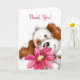 Niedlicher Hund hält eine große Blume vor ihm zu sagen " Danke ".