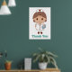 Niedliche Krankenschwester mit weißer Uniform und Hut und braunem Haar, hält sie eine blaue Krankenakte. Unten in blauer Schrift sind die Worte Dankeschön.