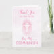 Perfekte Karte, um Menschen zu danken, die nachdenklich und großzügig an Ihrem Ersten Kommunionentag waren. Weich rosa Wasserfarbe war der Hintergrund des rosa Kreuzes, Gastgeber und Strahlen der Freude und Gnade. Ein moderner Script-Schriftart fügt die Dankeschön-Nachricht hinzu.