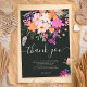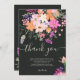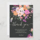 Fügen Sie Ihrem Baby oder Brautparty Ihre ganz persönlichen Dankkarten mit diesen originalen, niedlichen Blume in Rosa, lila, orange und grün Blume und Blätter auf bearbeitbarem dunklem Hintergrund hinzu