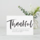 Dieses Dinner in Schwarz/Weiß mit einem fett gearbeiteten Pinselskript "dankbar" und moderner Typografie für Ihre Party-Details. Diese Einladung koordiniert mit der Lea Delaveris Design Thankful Erntedank Kollektion. Der Backer ist schwarz gesprenkelt.