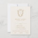 Diese elegante Creme und goldene formelle Hochzeitskarte aus der Daphne Collection ist perfekt für eine Hochzeit im Jahrgang. Das schlichte und dennoch klassische Design besticht durch ein elegantes und zeitloses verziertes Wappen-Monogramm mit Blumengestalten und Grünpflanzen, die die Initialen des Ehepaares umgeben. Diese Hochzeitskarte frage den Gästen bequem, was sie am Empfang essen möchten.