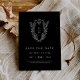 Diese klassische, dunkelschwarze klassische Hochzeit rettet das Datum aus der Daphne Collection ist perfekt für eine traditionelle Hochzeit. Das schlichte und dennoch raffinierte Design zeichnet sich durch ein elegantes und zeitloses Vintages Wappen-Monogramm aus, das mit Blumen und Grünpflanzen die Initialen des Paares umgibt.
