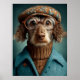 Ein charmanter, anthropomorpher Hund mit aquamarinem Mantel, braun gestricktem Rollkragen und gemustertem Brett, komplett mit runden Gläsern. Dieses wunderschöne Porträt verbindet Laune und Eleganz und ist somit perfekt für Tierfreunde und Kunstliebhaber. Ideal für besondere Geschenke, Zuhause-Dekor oder Statement-Mode-Accessoires.