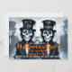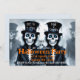Dapper Spirits & Fogbound Fright Halloween-Party Einladung Ein raffiniert gestaltetes Halloween-Angebot mit zwei Skelettwirten in schwarzer Kleidung, komplett mit Top-Hüten und leuchtend blauen Augen. Set vor einem schattenspendenden Hintergrund, das Design erinnert an gotischen Charme und spektrale Eleganz. Ideal, um den Ton für ein geheimnisvolles Soirée zu setzen, mit individuell anpassbarem Namen und Details, um Ihre eigene ghosting-Ansammlung zu erfüllen.