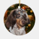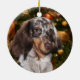 Langhaarige, oder gepunktete Dackel mit einem Weihnachtsbaum im Hintergrund Hunde Liebhaber Weihnachtsfeiertag Schmuck