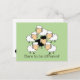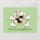 Sonnige schwarze Schafe Postkarte. Eine Gruppe weißer Schafe mit rosa Gesichtern und grauen Ohren umgibt ein wolliges schwarzes Schaf, auch mit einem rosa Gesicht und grauen Ohren. Unten ist eine Beschriftung "wagen Sie es, anders zu sein" in schwarzer Schrift.