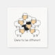 Funny schwarze Schafservietten. Eine Gruppe weißer Schafe mit rosa Gesichtern und grauen Ohren umgibt ein wolliges schwarzes Schaf, auch mit einem rosa Gesicht und grauen Ohren. Unten ist eine Beschriftung "wagen Sie es, anders zu sein" in schwarzer Schrift.