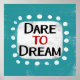"Dare To Dream" ist ein niedliches inspirierendes oder motivierend Zitat mit einer weißen Akzent-Form, umgeben von weißen, texturierten, whimsikalen Punkten.