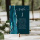 Der links Rand dieser eleganten, modernen Hochzeitskarte weist eine aquamarine blaue Aquarellgrenze mit Imitaten silbernen Glitzer auf. Das Wort "Tabelle" erscheint in silbergrauer Schrift auf dunkelblauem Hintergrund. Fügen Sie die Namen Ihrer Gäste hinzu, die jeder Tabelle zugeordnet sind.