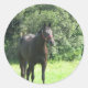 Dunkles Buschpferd stehend in einem grasbewachsenen Feld.