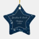 Dieses hübsche Weihnachtsschmuck besticht durch Ihr eigenes Foto in einem glänzenden, sternförmigen Imitat-Diamantrahmen. Der Rahmen ist auf einem dunkelblauen Nachthimmel mit weißen Schneeflocken und Sternen verziert. Die Rückseite des Ornaments hat den gleichen Hintergrund, mit dem Text in Weiß auf der passenden blauen Mitte. Ein schönes Sakraldekorat zum Gedenken an Ihre Weihnachtsfeier!