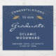 Feiern Sie den Meilenstein Ihres Absolventen stilvoll mit diesen individuellen Abschluss-Schaumweinflaschen-Etiketten, die mit den Worten "Herzlichen Glückwunsch an unseren Absolventen" in weißem Text auf dunkelblauem Hintergrund. Das Wort "Graduate" erscheint in einem anmutigen Skript im Handschriftenstil. Ein paar goldene Imitate Glitzer Mörtel-Kappen und eine Streuung von Goldkonfetti schmücken den oberen Teil des Etiketts. Personalisieren Sie es mit dem Namen, der Schule und dem Jahr des Abschlusses.