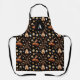 Whimsikale Bienen thematische Schürze mit dunkelcotegrierten Bienen, Bienenstöcken und botanischen Blumenbildern, personalisierter Text in Monogramm, schwarzer Hintergrund.