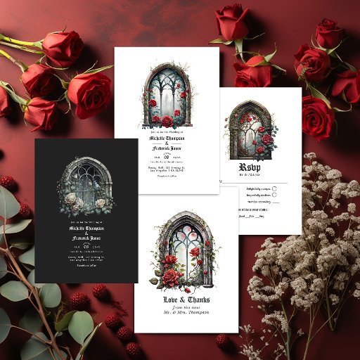 Gotische Hochzeitseinladung mit Schlossfenstern, die auf Ihre Veranstaltungsspezifikationen zugeschnitten sind.