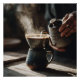 Dicker, aromatischer Dampf wallt nach oben, während ein stetiger Strom heißen Wassers aus einem handgefertigten Keramik-Kessel in einen gerippten Dripper fließt, der auf einer passenden Steinzeug-Tasse sitzt. Tiefblaue schwarze Glasur fängt warmes Seitenlicht ein und offenbart jede texturierte Unvollkommenheit und handgefertigte Schönheit der Töpferei. Dieser intime Moment des langsamen Bratens erfasst die stille Freude des achtsamen Kaffeekochens, perfekt für Küchenwandkunst, Leinwanddrucke, Tassen, Schürzen, Mauspad, Teetücher und Dekor, der das einfache Ritual einer perfekten Tasse würdigt.