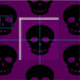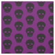 Diese schwarzen Schädel sind in einem Polka Dotmuster auf einem lila Hintergrund.