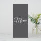 Elevate your reception dining experience with this elegant dark gray wedding menu card. Featuring a rich charcoal background paired with refined serif text and delicate script headings, this design presents each course with timeless sophistication.