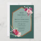Eine lustige und stilvolle boho Einladung mit einem goldenen geometrischen Rahmen vor dunkelgrünem Hintergrund. Der Rahmen wird von bordeauxroten Rose, rosafarbenen Pfannkuchen und Federn betont. Ihre Namen und Details erscheinen in einem zurückhaltenden und ausgeklügelten Serif-Schriftart. Auf der Rückseite sind Ihre Namen in einem vollfarbigen Hintergrund dargestellt.