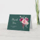 Ein klassischer gefalteter Dankeschön in einem leichten, luftigen Script-Schriftart. Die Vorderseite der Karte ist mit bordeauxroten Rose, rosafarbenen Pfannkuchen und Federn vor einem dunkelgrünen Hintergrund für einen farbenfrohen Pop versehen. Das Innere ist leer, damit Sie sich persönlich bedanken