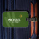 Ein schönes Gepäckanhänger personalisiert mit dem Namen des Reisenden auf dunkelgrünem Hintergrund